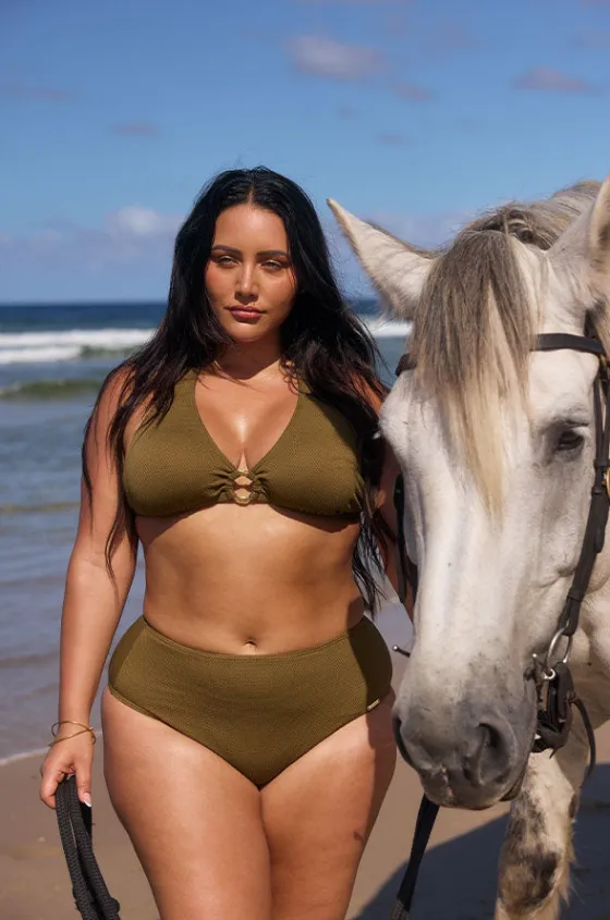 Capriosca Zanzibar Tri in Khaki features a halterneck design, front ring detail, adjustable ties, removable cups, and is best suited to B-D cup sizes.