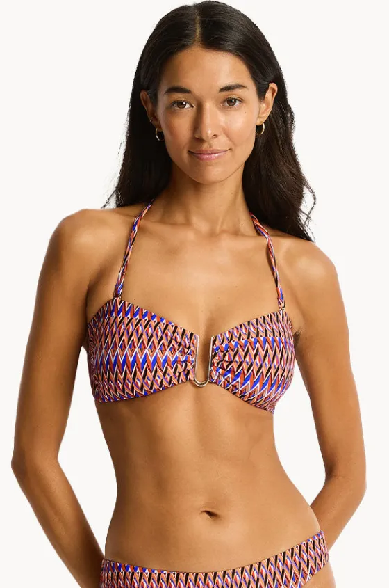 Sea Level Tessera U Bar Bandeau in Blue features a front U-bar detail, removable cups, side boning, optional straps, powermesh, and is designed for B-D cups.