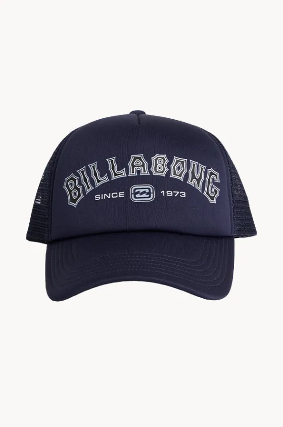Billabong Boys Bracket Trucker Cap in Dark Navy features a curved brim, front Billabong branding decal, mesh panelling, adjustable back, available in O/S.