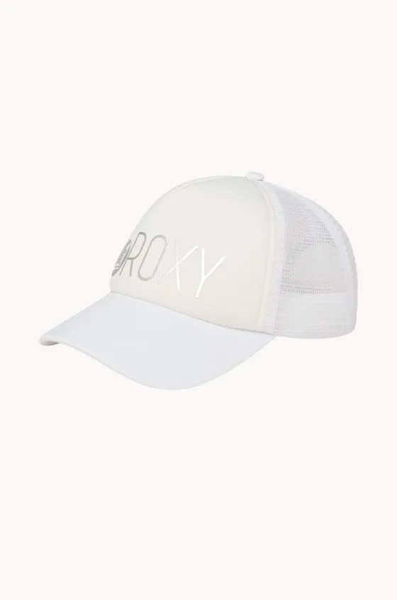 Roxy Girls Reggae Town Cap in White features a trucker style, curved brim, metallic Roxy lettering, adjustable snap back, and is available in O/S.
