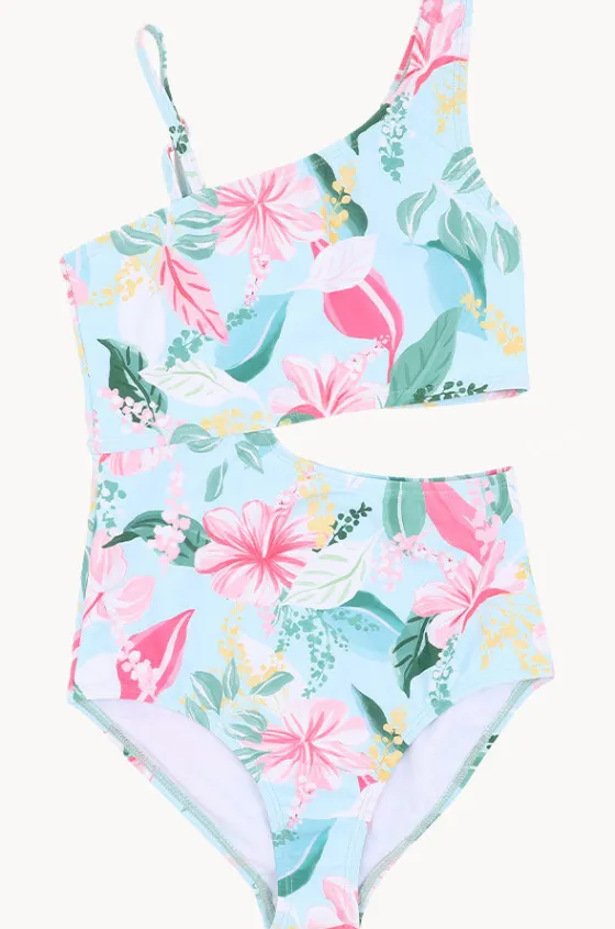 Minihaha Teen Girls Keely Cut Out One Piece in Blue/Multi features an asymmetrical neckline, adjustable thin strap, fully lined, and is available in sizes 8-14.