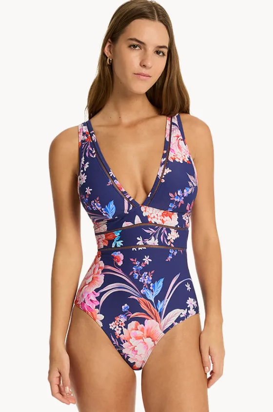Sea Level Indochine Spliced One Piece in French Navy offers stretch ladder trim, removable cups, adjustable straps, powermesh, is best suited to B-D cup sizes.