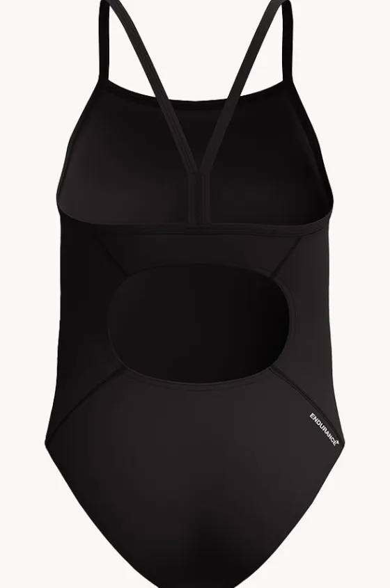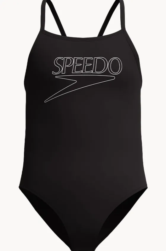 Speedo Girls Classic Logo One Piece in Black features a round neckline, thin straps, front lined, chlorine resistant, and is available in sizes 10-16.