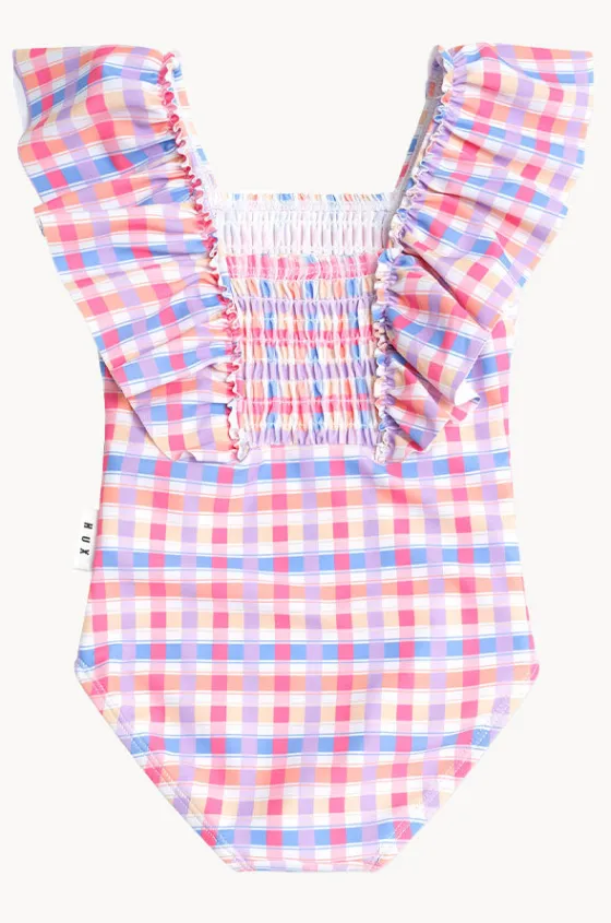 Huxbaby Girls Rainbow Check Shirred Frill One Piece in Multi features a shirred bodice, frill sleeves, sun protection rating, and is available in sizes 2-6.