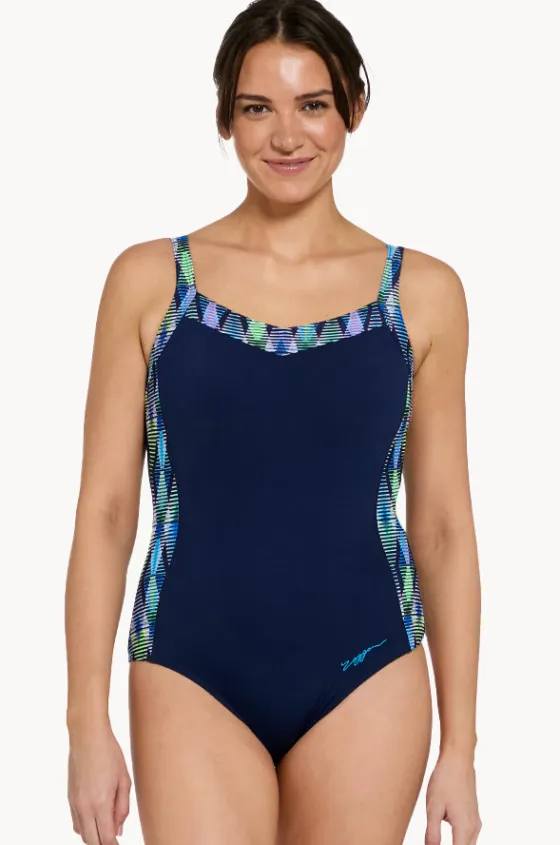 Zoggs Circus Ankor Clipback One Piece in Navy/Blue features adjustable straps, back clip, shelf bra, chlorine resistant thread, is best suited to B-E cup sizes.