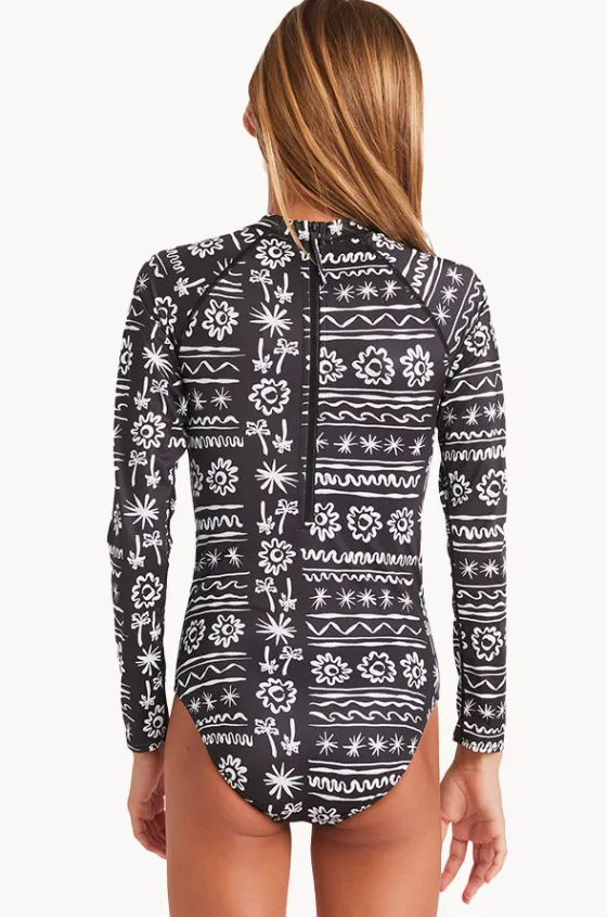Billabong Girls Lost On You Long Sleeve Sunsuit in Black offers long sleeves, sun protection rating, back zipper, sustainable, and is available in sizes 10-14.