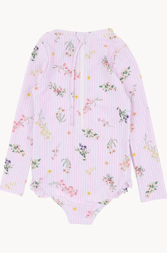 Minihaha Girls Myra Sunsuit in Pink/Multi features a round neckline, back zipper, frill detailing, sun protection, long sleeves, and is available in sizes 3-6.