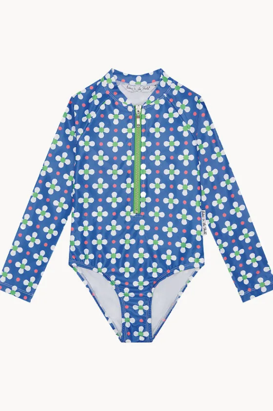 Babes In The Shade Teen Girls Clover Sunsuit in Blue/White offers a front zip, long sleeves, sun protection, chlorine resistant, and is available in sizes 6-14.