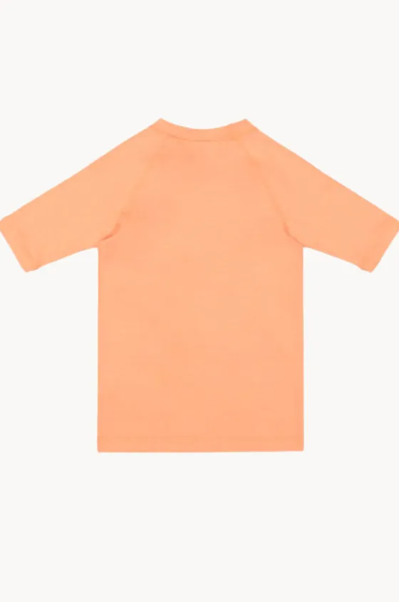 Roxy Girls Essential Short Sleeve Suntop in Coral features a round neckline, long sleeves, sun protection, sustainable fabric, and is available in sizes 4-7.
