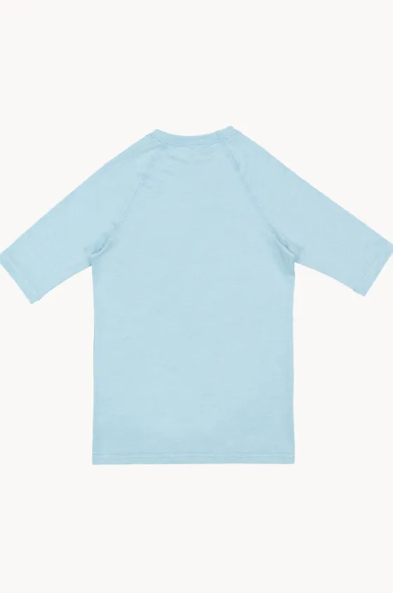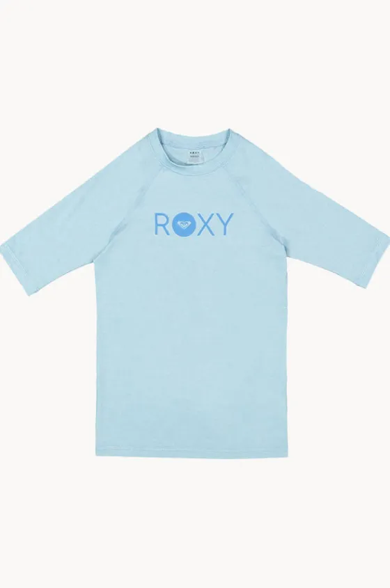 Roxy Girls Essential Long Sleeve Suntop in Sky Blue offers a round neckline, short sleeves, sun protection, sustainable fabric, and is available in sizes 8-16.