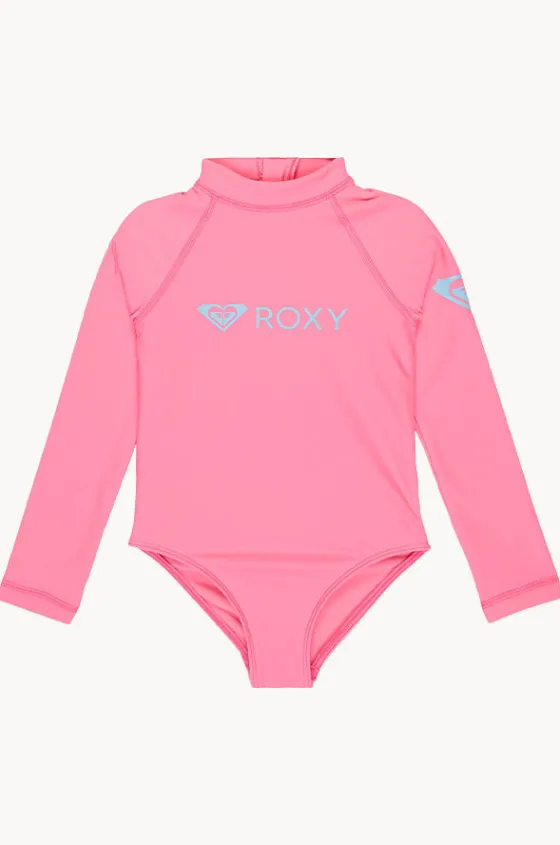 Roxy Girls Heater Long Sleeve Sunsuit in Pink features Roxy branding, high round neck, back zip, long sleeves, thermal, and is available in sizes 3-7.