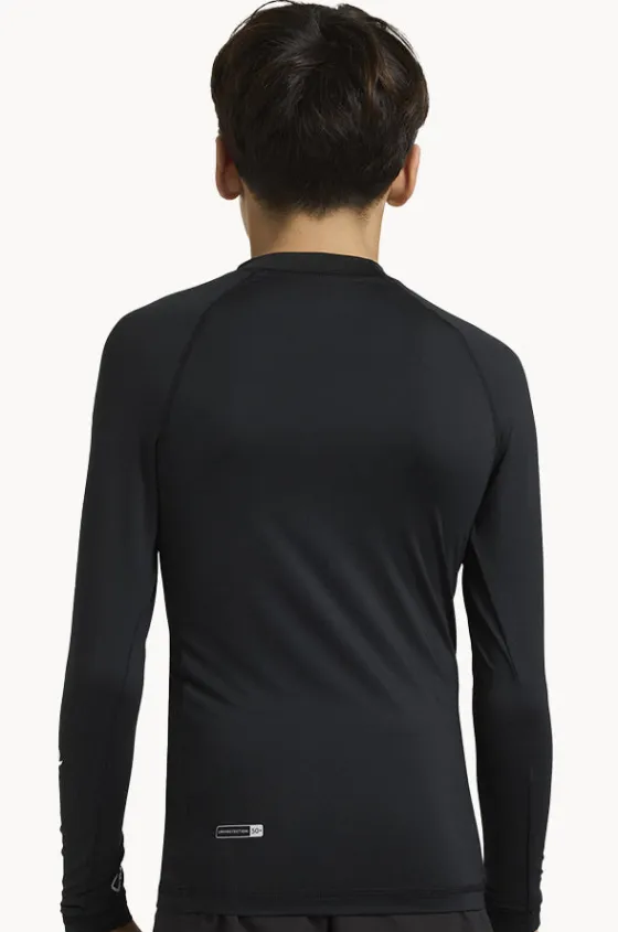 Quiksilver Boys All Time Long Sleeve Suntop in Black features a high neckline, long sleeves, sun protection rating, snug fit, and is available in sizes 10-16.