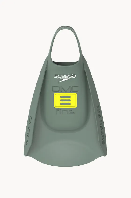Speedo X DMC Super Fin in Olive features a unisex training fin, reverse V rail technology, universal foot cavity, and is available in sizes XS-XL.