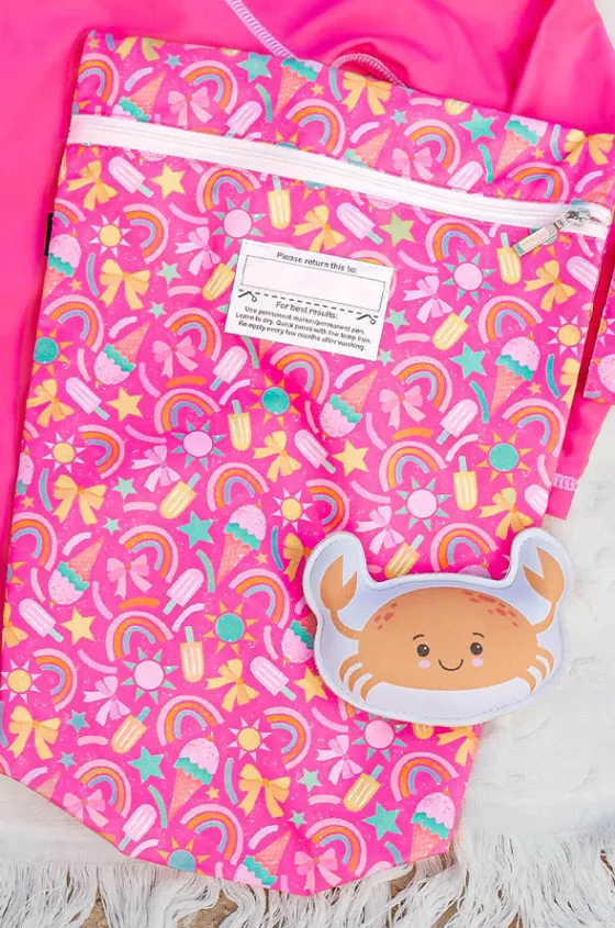 Bedhead Summertime Wet Bag in Hot Pink features a leak-free bag, carry handle, secure zip closure, and has a return-to label.