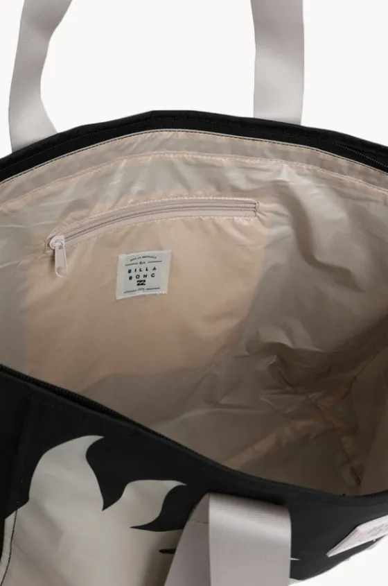 Billabong Keenie Tote in Black/White features a tote style bag, dual shoulder straps, interior zip pocket, placement print, and is available in O/S.