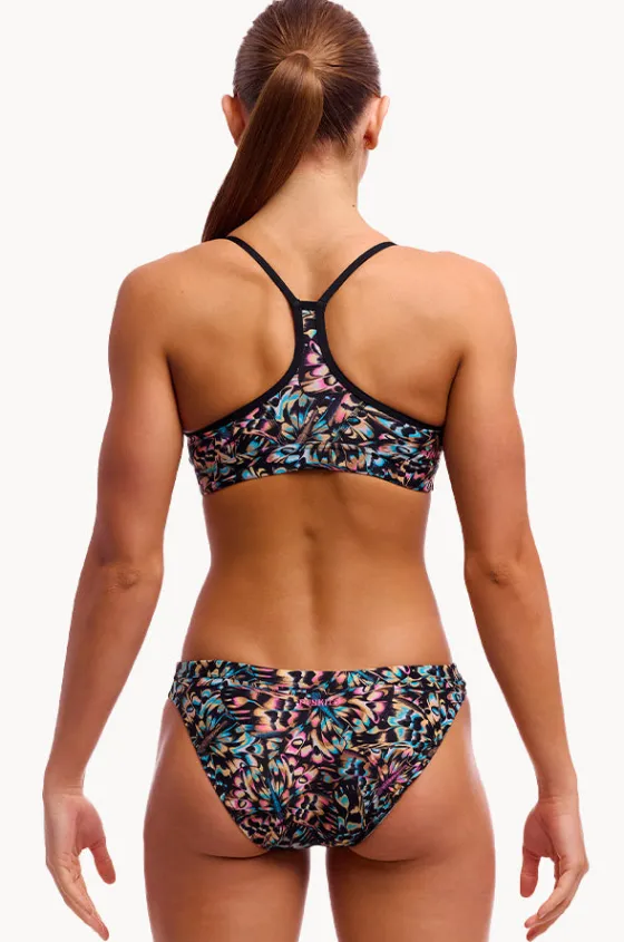 Funkita Copper Cluster Crop Set in Black/Multi features double bind straps, hipster pant with drawcord, chlorine resistant, and is best suited to A-C cup sizes.