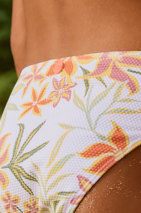 Roxy Girls Floral Horizon Bralette Set in White features a bralette top, fixed straps, matching hipster pant, textured fabric, and is available in sizes 10-16.