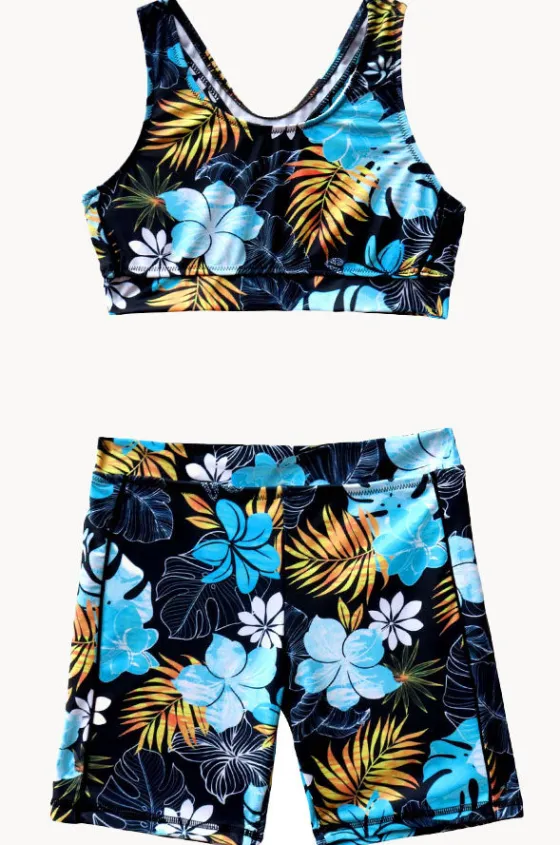 Salty Ink Girls Tropicana Action Crop Set in Black features a crop top, fixed racerback straps, matching bike short, and is available in sizes 8-16.