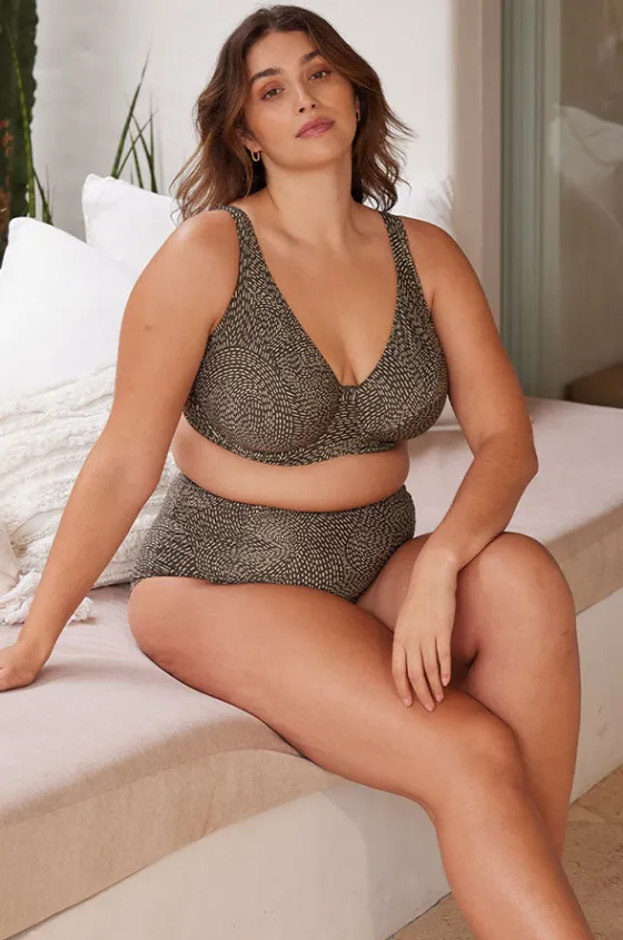 Artesands Onda Perspective Goya G Cup Bra in Olive features a modest neckline, underwire, adjustable straps, powermesh, and is best suited to a G cup size.
