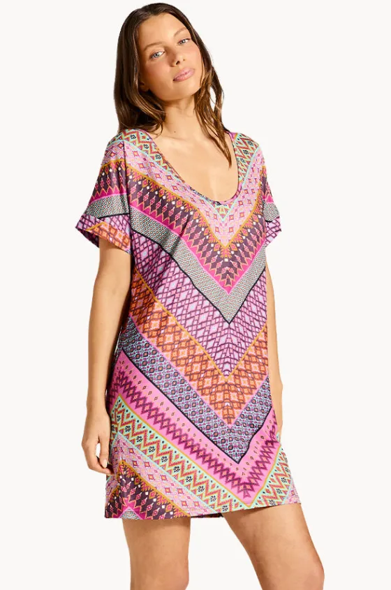 Tigerlily Utopia Lara Mumu in Multi features a scoop neckline, short sleeves, straight fit, short length, stretchy fabric, and is available in sizes 8-16.