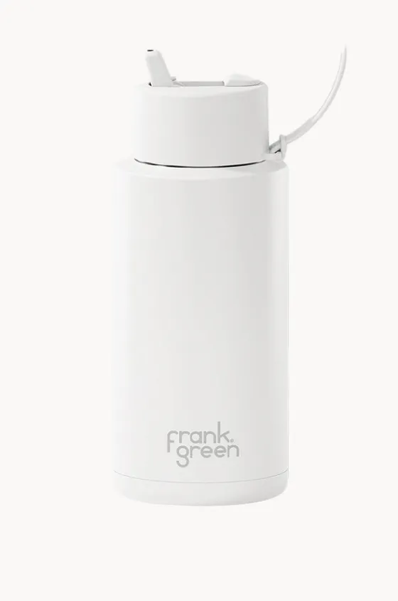 Frank Green Ceramic Drink Bottle 1L in Cloud offers a straw lid, carry handle, triple wall vacuum insulated design, and is available in a 1L capacity.