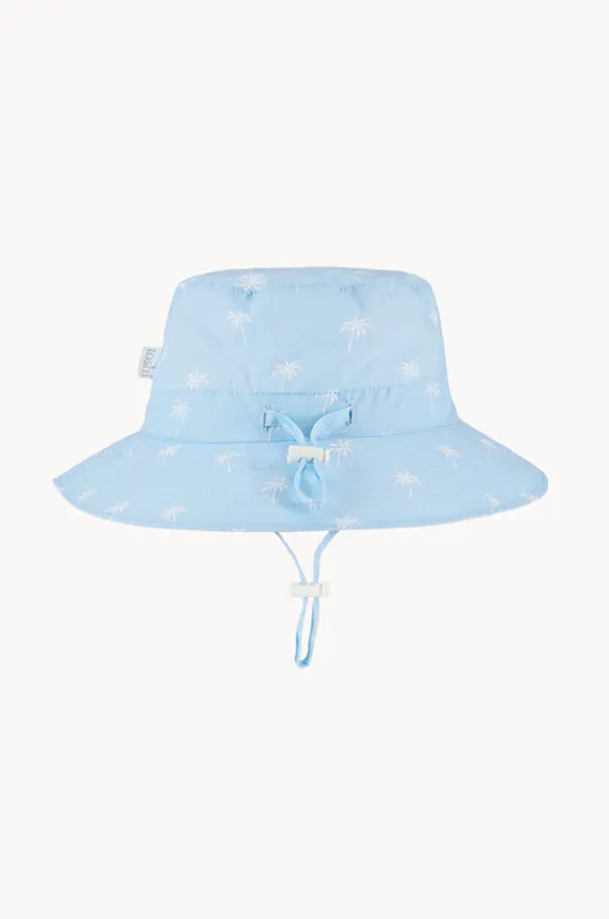 Toshi Girls Palm Spell Sunhat in Sky features a bucket style hat, brim, sun protection rating, chin strap with toggle, and is available in sizes S-XL.