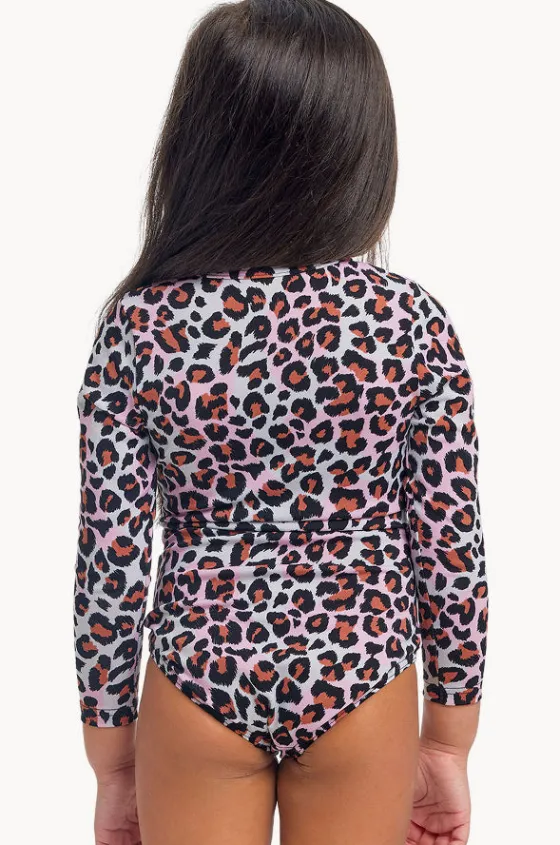 The Funkita Girls Some Zoo Life Sunsuit in Leopard features long sleeves, front zip, chlorine resistant fabric, UPF 50+ sun protection, available in sizes 1-7.