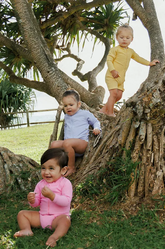 Tini Togs Baby Girls Long Sleeve Zip Sunsuit in Marshmellow features long sleeves, sun protection rating, full length zipper, and is available in sizes 0-3.