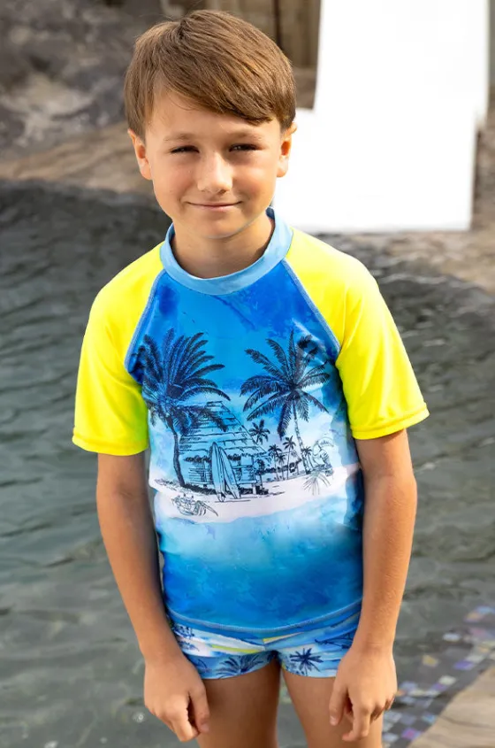 Salty Ink Boys Shipwrecked Short Sleeve Suntop in Blue/Yellow features a high neckline, short sleeves, sun protection rating, and is available in sizes 3-8.