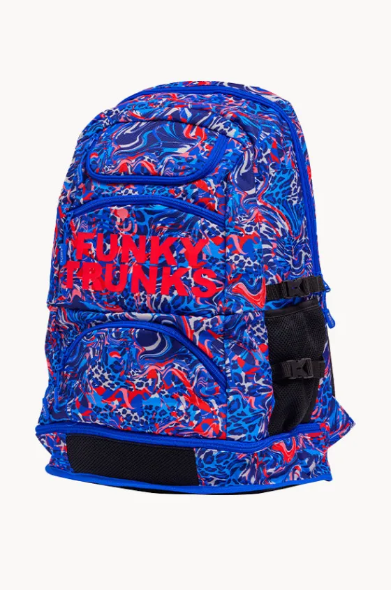 Funky Trunks Mad Cat Elite Squad Backpack in Blue/Red features multiple compartments, chest strap, waterproof base, spray-proof, and is available in O/S.