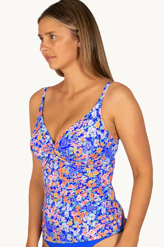 Baku Biarritz D/E Cup Wrap Tankini Separate in Sapphire features a wrap front, underwire, powermesh, adjustable straps, and is best suited to D-E cup sizes.