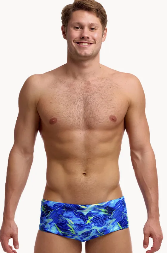 Funky Trunks Mens Storm Chaser Trunk in Blue/Yellow features 16.5cm sides, front lining, elastic waistband and leg openings, and is available in sizes 30-38.